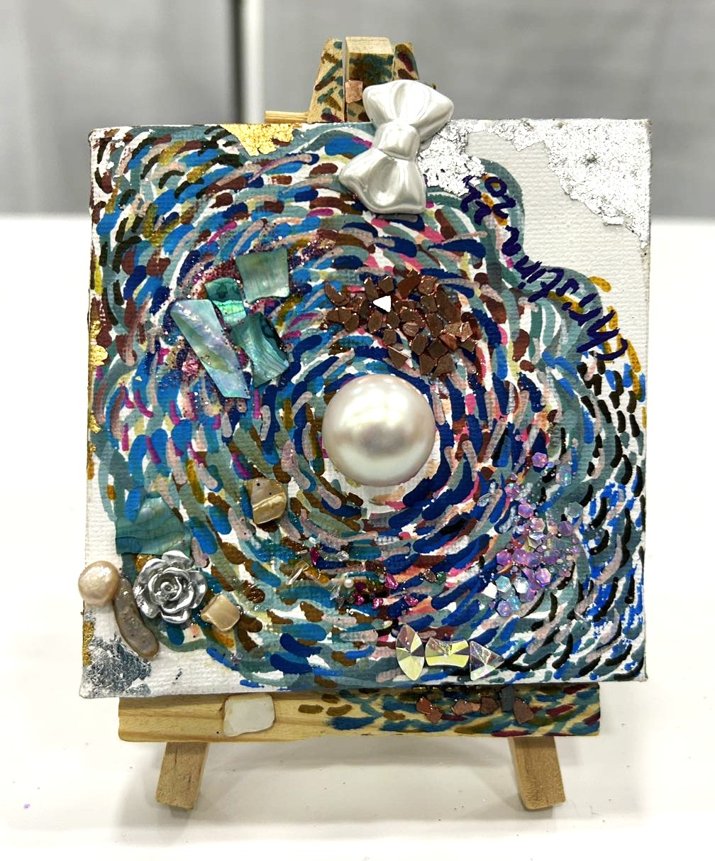 This beautiful mini artwork is a mix of colors, textures, and elegance. Swirls of blue, pink, gold, and brown create a lively pattern that leads the eye to a shiny pearl in the center.